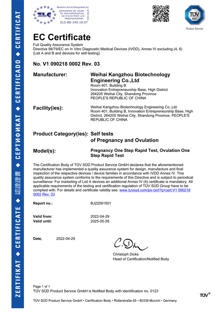 ? ? ?威海康州生物工程有限公司成立于2013年,公司坐落于風(fēng)景秀麗的海濱小城——威海市。康州生物是集研發(fā)、生產(chǎn)和銷(xiāo)售于一體的生物科技公司,與威海哈爾濱工業(yè)大學(xué)合作研發(fā)團(tuán)隊(duì),擁有先進(jìn)的科研基地及生產(chǎn)基地。主要從事快速診斷檢測(cè)產(chǎn)品的研發(fā)、生產(chǎn)、銷(xiāo)售。產(chǎn)品涵蓋:生育檢測(cè)、藥物濫用檢測(cè)、農(nóng)藥殘留檢測(cè)以及其他臨床診斷檢測(cè)等。公司自主研發(fā)生產(chǎn)得早早孕試紙,排卵檢測(cè)試紙,毒品檢測(cè)及疾病檢測(cè)等醫(yī)用產(chǎn)品,經(jīng)過(guò)歐盟認(rèn)證,產(chǎn)品質(zhì)量穩(wěn)定,值得信賴(lài)。